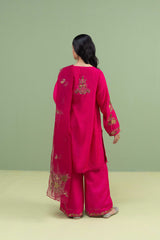 An embroidered paneled kurta on a golden-speckled base, with a round neckline and V-slit, adorned with delicate embroidery and sequin detailing. Embroidered details on the sleeves, hem, and back add richness to the silhouette. Paired with matching culottes embroidered at the hemline and and embroidered organza dupatta for a refined finish.