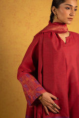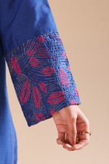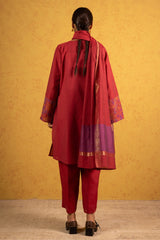 Classic-fit shirt detailed with refined stitching along the neckline and embroidered sleeve borders. Paired with straight-fit trousers, finished with subtle patch detailing along the hemline. Styled with a dupatta featuring lurex borders for a polished, classic look.