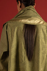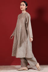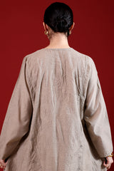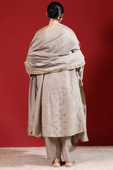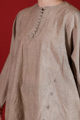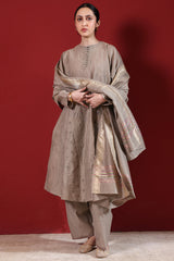 Embroidered paneled kurta with a round neckline, detailed with soft pleating and loop button accents along the front slit. Paired with a classic-fit shalwar finished with embroidered detailing at the ankle hems. Styled with a dupatta featuring lurex borders for a refined, classic finish.