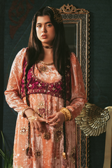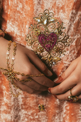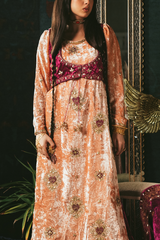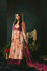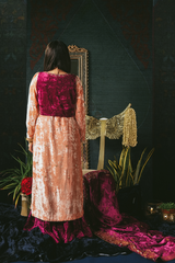 Richly embroidered textured velvet shirt, adorned with gota detailing along the neckline and sleeve hems. Delicate heart-inspired embroidered motifs, enhanced with gota and sequin detailing throughout, create a festive allure. Paired with a short sleeveless embroidered koti, detailed with gota, sequins, and tassel accents. Styled with a rich velvet sharara for a statement festive look.