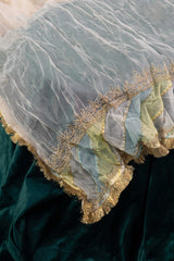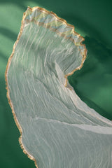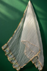 An embroidered organza dupatta adorned with golden threadwork and chata patti borders, finished with delicate kiran lace along the edges.