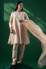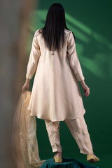 A luxury flared shirt crafted from rich fabric, with a round neckline and loop buttons along the front slit and sleeve hems. Golden lace accents the sleeves, while tassel detailing at the back adds charm. Styled with a lace-embellished classic-fit shalwar and an organza dupatta finished with golden lace detailing.