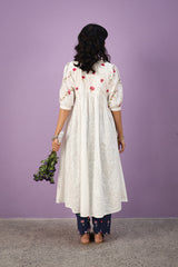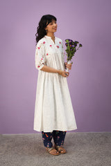 A classic fit flared embroidered frock featuring a round band neckline with a V-slit, adorned with a floral embellishment. The bodice is enriched with delicate phool embroidery, accentuated by fine stitching. Soft gathers at the empire waist create a graceful flare, while cinched sleeves add a refined touch. Can be paired with any Gen Fits