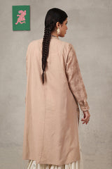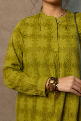 A refined silhouette ‘Fling of Spring’ kurta, featuring a band neckline adorned with button details on the placket. The kurta is enriched with self-embroidered details and fine custom-made schiffli detailing, while the cuffed sleeves are accented with delicate button embellishments. Can be paired it with any Gen fit for a versatile look.