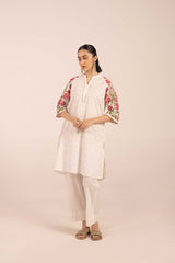 A classic-fit kurta features a band neckline with a front placket adorned in colorful stitching and subtle mukaish detailing. Sleeves are enhanced with vibrant gul bhaag embroidery and finished with delicate lace trim at the hems. Can be paired with any fits for chic look.