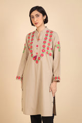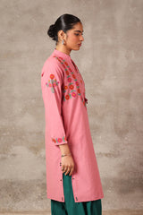 A straight fit shirt with hand embroidered and gulab applique/ralli details.