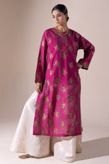 Jacquard paneled shirt with a round neckline and V-slit, adorned with embroidered detailing and sequin work along the neckline and sleeve hems. Comes with an inner slip for added comfort and ease.