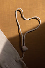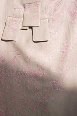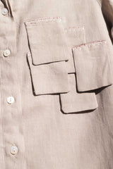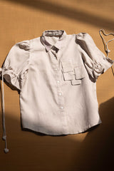 An embroidered button-down top with a collared neckline, featuring statement drawstring tassel sleeves and embroidered patches while intricate embroidery graces the back, seamlessly blending structure with playful artistry.