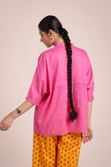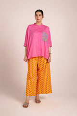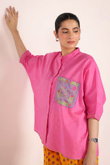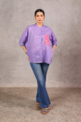 A relaxed-fit embroidered top featuring a band neckline with stitching detail on the neckline, sleeves, and hem. Designed with a drop shoulder for added ease, and a front pocket adorned with colorful, lively embroidery that adds a playful touch. Pairs effortlessly with any generation of bottoms.