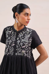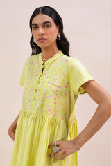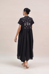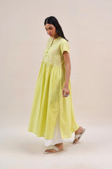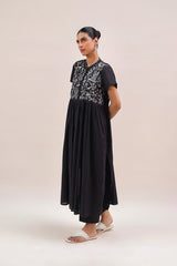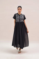An embroidered flared dress featuring stitch detailing on the neckline and loop buttons on the front placket. The bodice is enhanced with embroidery, while the sleeve hems are adorned with lace trim. Can be paired with any Generation bottoms for a complete look.