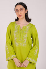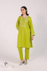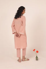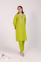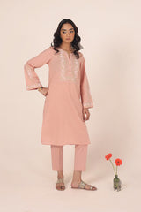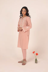 A solid-hued straight-fit kurta featuring a round neckline with a V-slit, adorned with delicate buttons on the front placket. The bodice is elevated with soft pastel-hued Taj embroidery, mirrored on the sleeves for a cohesive look. Embroidered borders further enhance the design. Paired with solid-hued, classic straight-fit trousers for an elegant finish.