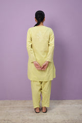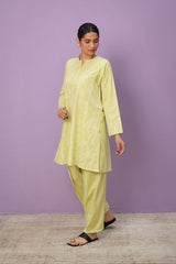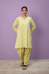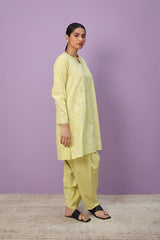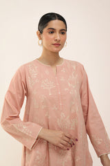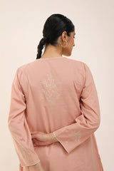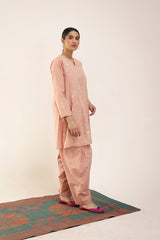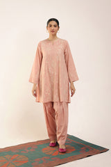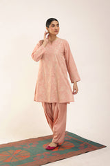 An embroidered paneled kurta with a round neckline and V-slit, adorned with delicate scattered embroidered motifs. The sleeve hems feature intricate detailing, while a gul booti motif graces the back. Paired with a solid-hued printed pegged shalwar.