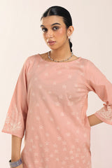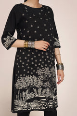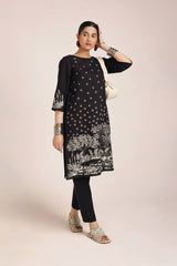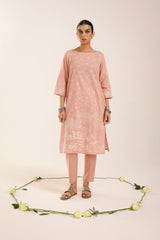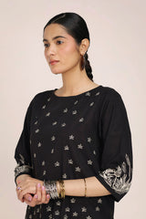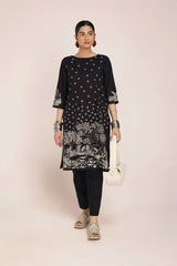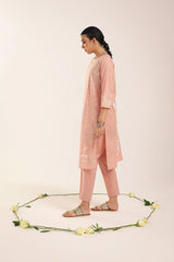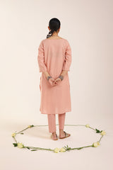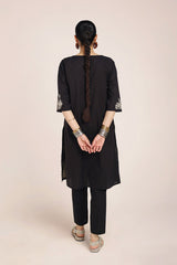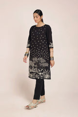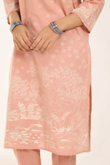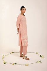 A straight-fit kurta featuring a round neckline, adorned with intricate Bagh-e-Aab embroidery—capturing the essence of flowing waters and lush gardens. Delicate motifs are scattered across the fabric, while the sleeve hems are enhanced with Gulzar embroidery, adding a poetic charm. Paired with solid classic straight-fit trousers for an effortlessly graceful look.