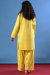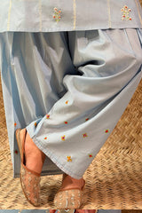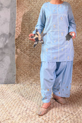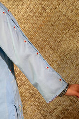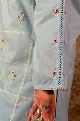 Hand-embroidered classic-fit shirt with a round neckline and subtle stitching detail along the sleeve hems. Paired with a coordinated embroidered Farshi shalwar with soft scalloped edges.