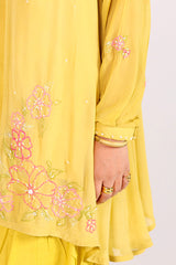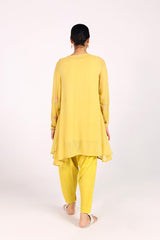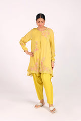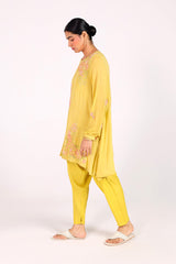 An embroidered open-slit kurta featuring a round neckline and a flared front slit design. Adorned with delicate embroidered motifs enhanced by subtle bead embellishments throughout. The cuffed sleeves are also decorated with beadwork. Comes with a comfortable solid inner for ease, paired perfectly with solid pegged shalwar for a polished look.