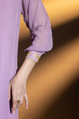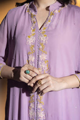 A formal classic-fit long shirt detailed with delicate embroidery, featuring a low band and V-neckline adorned with subtle beadwork along the front slit. The open-front silhouette adds a hint of modern ease, complemented by cuffed sleeves and relaxed culottes for festival look.