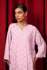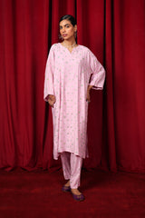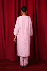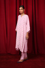 Radiating understated allure, this loose-fit formal kurta is adorned with intricate sequin work, gracing both the overall design and sleeves. The round neckline with a V-slit adds a refined touch. Paired with matching straight-fit trousers, enhanced with subtle sequin accents, complete the look with effortless sophistication.