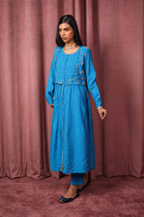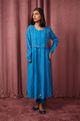 A formal frock-style kurta features a round neckline with subtle mukesh work on neckline and buttons on front slit. The attached koti is adorned with intricate golden embroidery and tassels, while the sleeve hems are finished with mukesh detailing and golden accents. The back of the koti showcases delicate golden tilla embroidery. The empire waist gathers create a natural drape. Paired with solid-hued straight-fit trousers for an elegant, timeless look.
