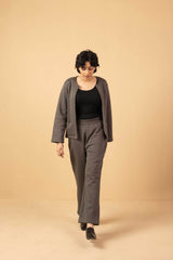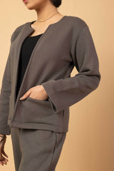 A front open fleece jacket with side pocket details for that contemporary look. Paired with knitted flared trousers.