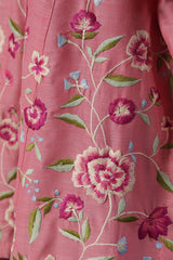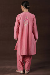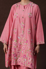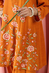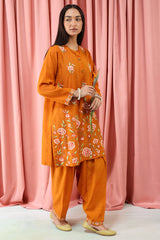 A delicate embroidered paneled A-line shirt with a round neckline and V-slit, adorned with buttons along the front placket. Paired with a classic-fit shalwar featuring embroidered detailing on the ankle hemline.