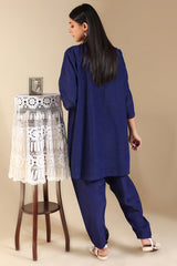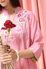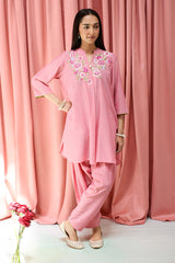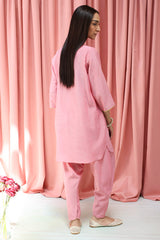 An embroidered classic-fit shirt with a low band neckline and V-slit, adorned with a pearl embellishment. Finished with a round shirt hem and paired with a classic-fit shalwar.