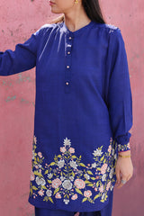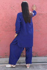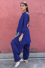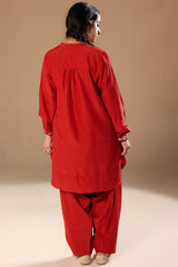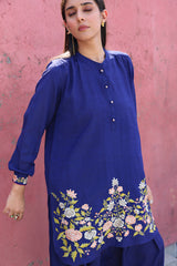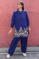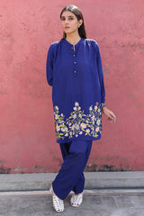 A classic-fit embroidered shirt with a low band neckline and buttons along the front placket, featuring embroidered cuffed sleeves and gentle gathers at the shoulders. Finished with a round shirt hem. Paired with a classic-fit shalwar.