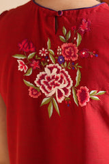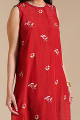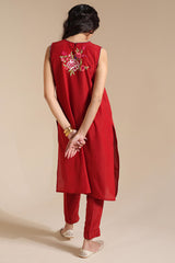 A classic-fit embroidered sleeveless shirt with a round neckline, featuring a keyhole back with a button detail. Paired with straight-fit trousers for a refined look.