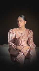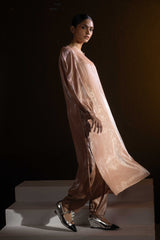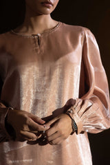 Dive into festive flair with this classic-fit shirt with a round neckline with a keyhole accent, adorned with button and fine stitching details. Puff sleeves are finished with gathered cuffs for added volume. Paired with a classic-fit shalwar, detailed with buttons on the ankle slits for a refined finish.