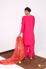 An embroidered kurta on a gold-speckled base, featuring a round neckline with a V-slit and enhanced with Mukaish detailing. The front is adorned with embroidered motifs for a rich, festive appeal. Paired with a farshi shalwar and a gold rose-printed organza dupatta, finished with refined edging and bead tassels at the corners, perfect for an elegant festive statement.
