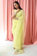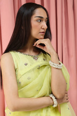 An embroidered organza saree, delicately embellished with tilla and sequins work, and finished with tassels at the corners for an elegant touch. Paired with a classic-fit sleeveless blouse featuring matching hand embroidery, this ensemble radiates timeless grace and festive sophistication.