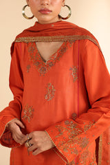Embroidered classic-fit paneled shirt with a V neckline, adorned with delicate embroidery and sequin detailing throughout. Finished with gota lace along the neckline, sleeve hems, and shirt hem. Paired with straight-fit trousers. Styled with a coordinated embroidered dupatta, enhanced with gold detailing along the edges for a refined, festive finish.