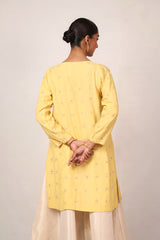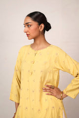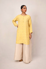 A formal paneled kurta features a round neckline with a V-slit, enhanced with intricate sequin detailing and buttons on the front slit. The kurta is further adorned with embroidered motifs, embellished with sequin work, while the sleeve hems are also beautifully enhanced with delicate sequin detailing.