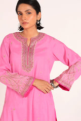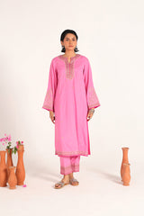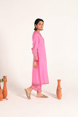 An embroidered shirt with a round neckline and V-slit, adorned with delicate embroidery and subtle sequin accents. The sleeves and hem are finished with intricate embroidery and dori pipping detailing for a refined touch. Paired with matching embroidered straight-fit trousers for a graceful, coordinated look.