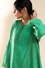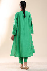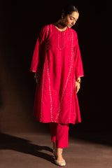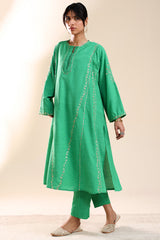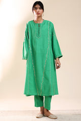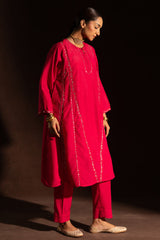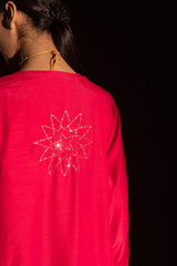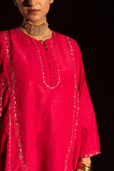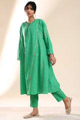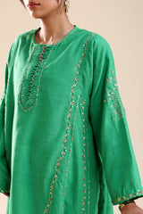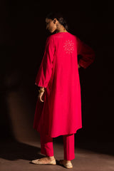 Hand-embroidered paneled kurta with a round neckline, detailed with delicate pleats and loop buttons along the front slit. Subtle sequin work is scattered throughout, adding a refined festive shimmer. Paired with straight-fit trousers for a balanced, elegant look.