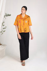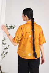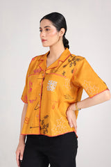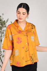 An embroidered top featuring a band collar neckline and buttoned front slit. Adorned with vibrant motifs of gulab, stars, playful Xs and Os and more , the embroidery highlights the neckline, front slit, and sleeve hems. Versatile and stylish, Can be paired with any generation of bottoms.