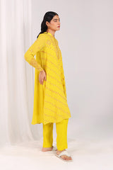 A hand-embroidered shirt featuring a button-loop front slit, adorned with kacha taanka embroidery and subtle mukaish highlights. Scattered motifs at the back add charm from every angle. Paired with solid straight-fit trousers for a timeless, refined look.
