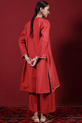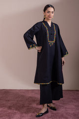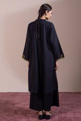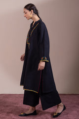 Hand-embroidered paneled kurta featuring a low band neckline with a V-slit, adorned with tassel detailing. Delicate hand-embroidered motifs add an artisanal touch, enhanced with colorful embroidery along the sleeves and rounded shirt hem. Paired with classic culottes for a refined look.