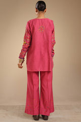 Hand-embroidered classic-fit l shirt featuring tailored embroidered sleeves, with embroidered detail along shirt border and back enhanced with aina work. Finished with a subtle rounded hemline. Paired with coordinated embroidered culottes.