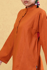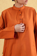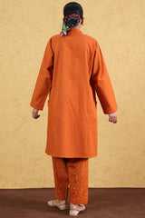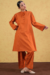 Hand-embroidered classic-fit shalwar paired with a paneled kurta having a band neckline and buttoned front placket. Finished with subtle button detailing on side slits classic, sophisticated look.