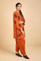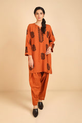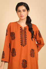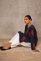 A loose fit tunic with round neckline with V slit, featuring all over embroidered motifs on shirt front and sleeves.