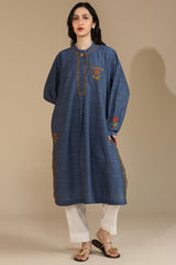 Hand-embroidered classic-fit shirt with a low band neckline and button detailing along the front placket. A front pocket adds a styled accent, while cuffed sleeve hems complete the look.