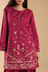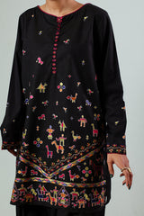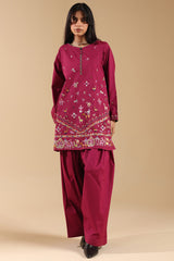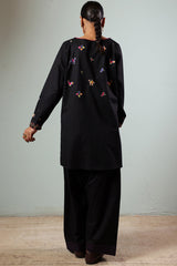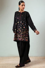 Hand-embroidered classic-fit shirt with vibrant loop button detailing along the front slit. Subtle drop shoulders lend a relaxed, contemporary ease. Paired with a farshi shalwar, finished with delicate stitching detail.