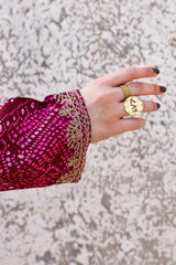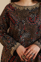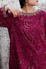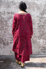 A classic-fit A-line printed shirt with a boat neckline, adorned with delicate golden embroidery along the neckline and sleeve hems. Paired with matching printed culottes.