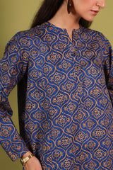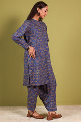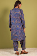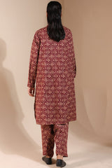 A classic-fit paneled printed shirt with a round neckline and V-slit, adorned with buttons along the front placket. Paired with a matching printed classic-fit shalwar.