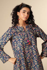 A classic-fit gold-printed shirt with a round neckline and V-slit, adorned with tassel detailing and bead accents on the sleeve hems. Finished with a round hem and paired with a matching printed classic shalwar.