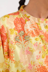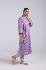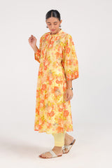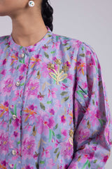 A printed shirt with a low band neckline, featuring buttons along the front placket. Gota-detailed motifs enhance its charm, while gathered sleeves add a graceful touch. Paired with classic straight-fit trousers finished with gota lace detailing.