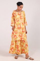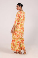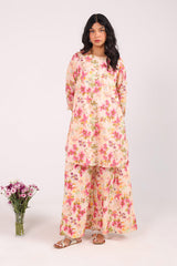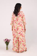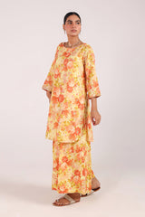 A floral-printed shirt with a round neckline, adorned with delicate stitching details. Gota lace accents the sleeve hems, while gota motifs are scattered throughout. Paired with matching printed culottes featuring gota lace detailing.