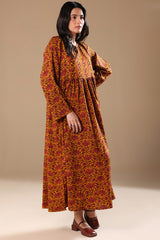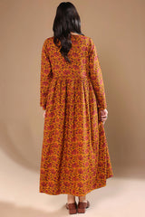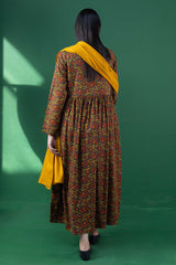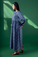 A printed long flared dress with a round neckline and V-slit. Gathers around the empire waist add graceful volume and movement, creating an effortlessly elegant silhouette.