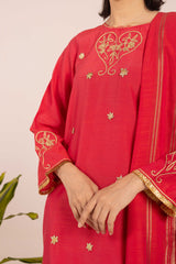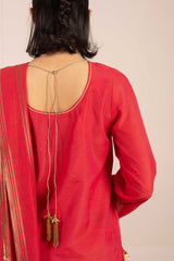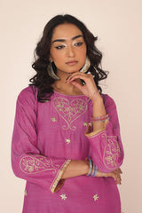 An exquisite gota-embroidered shirt featuring a round neckline trimmed with lace and adorned with Naqsh-e-Dil motifs. The sleeves and hem are detailed with gota work and finished with kiran lace, adding a regal touch. Scattered gota motifs shimmer across the kurta, while fine embroidery along the side slits elevates the look. The back is enhanced with playful tassel detailing. Paired with a classic-fit shalwar, finished with gota-lined accents for a refined finish.