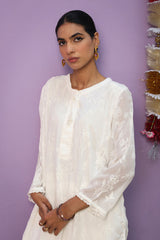 A classic fit self-embroidered kurta featuring a round neckline adorned with tassel detailing on the front placket. The gathered sleeve hems add a touch of volume, while delicate lace trim enhances the flare. Paired with a solid-hued classic fit shalwar, detailed with refined stitching at the ankle hemline.